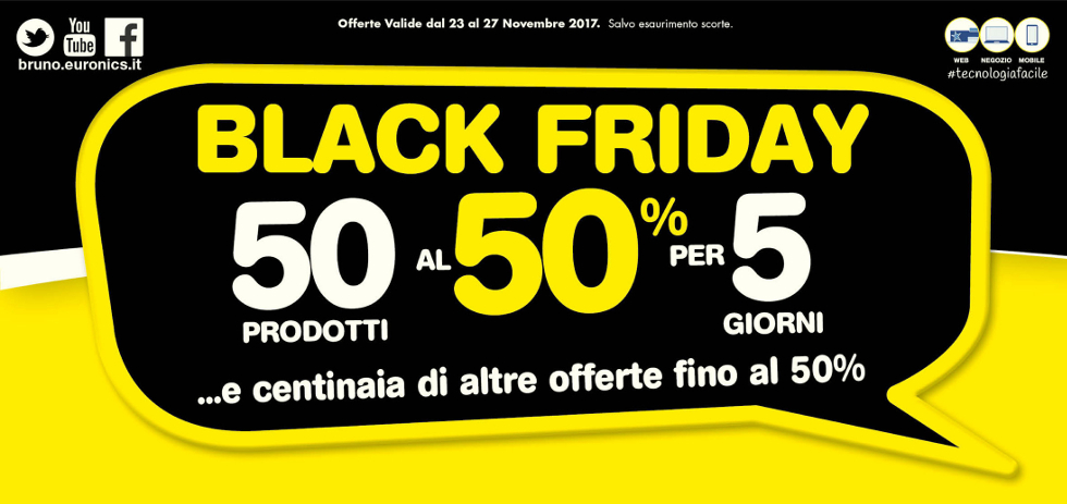 Euronics Bruno “Black Friday 50 prodotti al 50% per 5 giorni” dal 23 al 27 Novembre 2017
