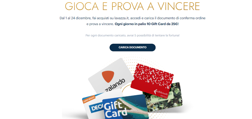 La seconda opportunità di vincita comprende gift card in palio dal valore di €25 in collaborazione con Feltrinelli, Zalando, Decathlon, L’Erbolario e Volagratis. Si partecipa acquistando un prodotto sul sito Lavazza e caricando lo scontrino sul sito.