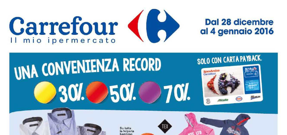 Tanti sconti con il 30%, 50% e 70% vi aspettano in questo nuovo mini volantino Carrefour. Tutte queste nuove offerte saranno valide dal 28 Dicembre 2015 fino al 6 Gennaio 2016.