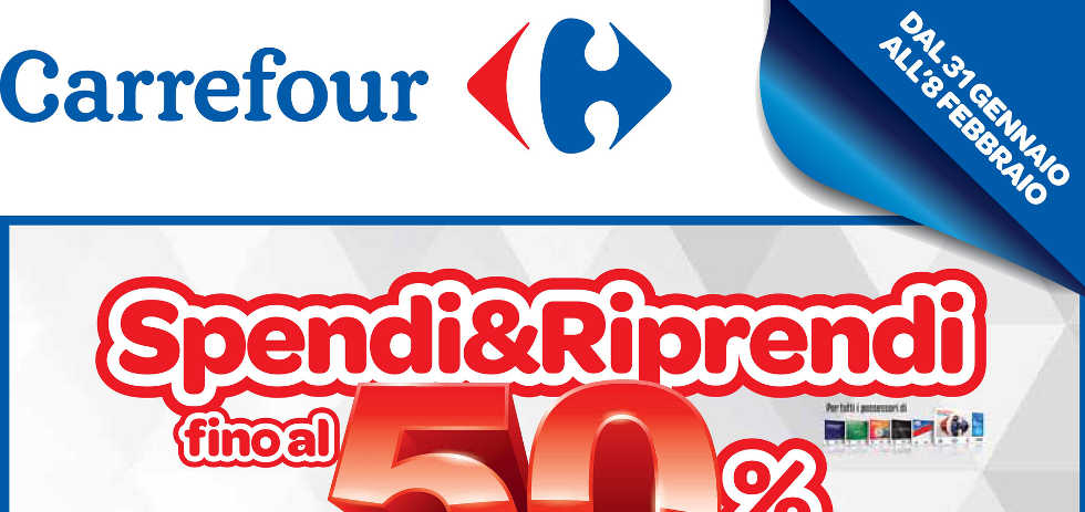 Volantino Carrefour “Spendi e riprendi fino al 50%” dal 31 Gennaio all’8 Febbraio 2018