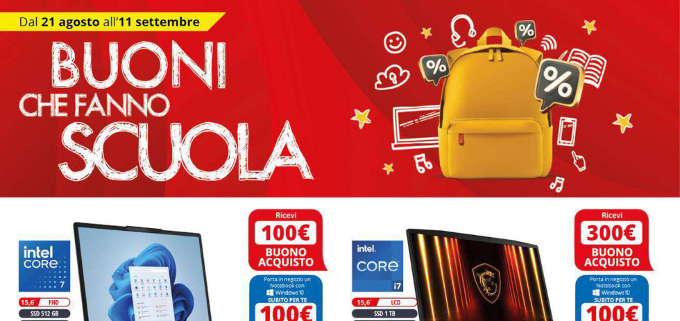 Già a guardare la copertina è chiarissimo che ci saranno occasioni di ogni tipo, ma andiamo per gradi. Innanzitutto, il titolo è ” buoni che fanno scuola “, una allusione alla grandiosa promozione pensata per prepararci al meglio al ritorno sui banchi di scuola. Per usufruirne, basta acquistare articoli che ben si prestano anche all’utilizzo per la scuola, come tablet o computer, ma va bene anche una TV, un grande elettrodomestico o addirittura un condizionatore. Il taglio del buono dipende dall’importo della spesa, per esempio con la spesa di €599 si ha diritto a un buono di €100, ma si arriva addirittura fino a €300. Ma la verità è che questa è solo un’anteprima, perché le opportunità sono davvero tante.