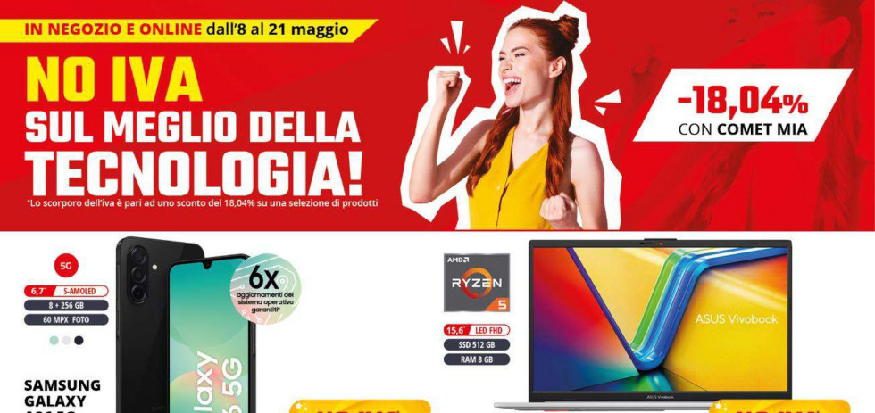 Anche questa settimana si delizia con ribassi incredibili. Il titolo è chiarissimo su quanto si aspetta all’interno: “no IVA” si proietta subito in un mondo di sconti che non vediamo l’ora di scoprire nel dettaglio. Non dobbiamo attendere molto, visto che in copertina troviamo subito tantissimi esempi provenienti dalle categorie più diverse. In questo modo abbiamo subito un assaggio del risparmio pensato per noi. A fare da apripista abbiamo in evidenza opportunità come il Samsung Galaxy A26 5G al meraviglioso prezzo di €302. In questa prima pagina non poteva mancare un esempio dal reparto dei grandi elettrodomestici, rappresentati a questo giro da una lavatrice Candy Classe a scontata al meraviglioso prezzo di €392.