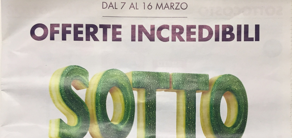 Il titolo è “Sotto costo” e all’interno troviamo in offerta il prosciutto cotto Negroni a €3,69, il Grana Padano a €8,89, il tonno Rio Mare a €5,99 e la passata di pomodoro Cirio a €0,76.