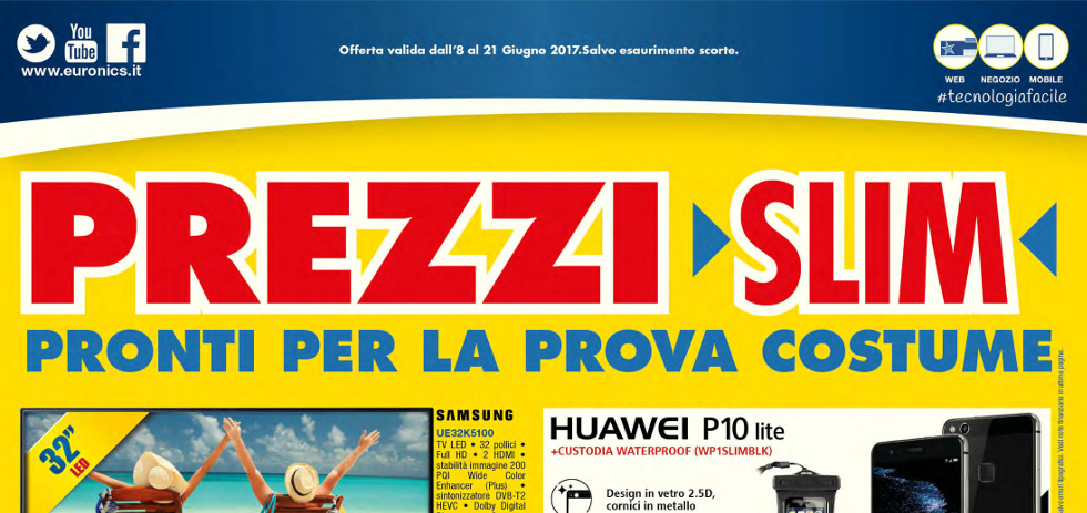 In copertina troviamo il tv Samsung UE32K5100 a €239, il Huawei P10 lite a €299, il notebook Lenovo 100-15IBD 80QQ01FSIX a €479 e la lavatrice Indesit EWC91083BSIT a €299.