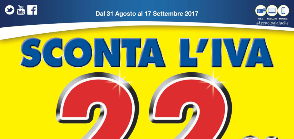 L’anteprima del nuovo volantino Euronics Tufano con cui chiudiamo questa serata s’intitola “Sconta l’IVA 22%” valida dal 31 Agosto al 17 Settembre 2017.