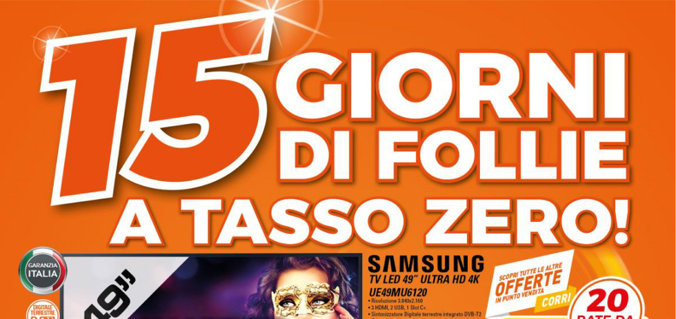 Ci viene proposto un tasso zero con prima rata a Giugno 2018, all’interno vi segnaliamo delle ottime offerte sui televisori.