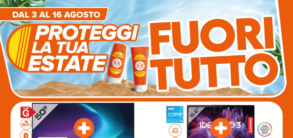 Il titolo è “Fuori tutto” e in copertina abbiamo articoli appartenenti a diverse categorie, per avere un’idea di ciò che ci aspetta continuando a sfogliare. Per esempio troviamo qui la lavatrice classe A Samsung con carico fino a 9 kg a €549, ma anche dal reparto telefonia il tanto agognato Samsung Galxy S22 da 128 GB a €499,90 o il Lenovo Ideapad con RAM da 8 GB a €399.