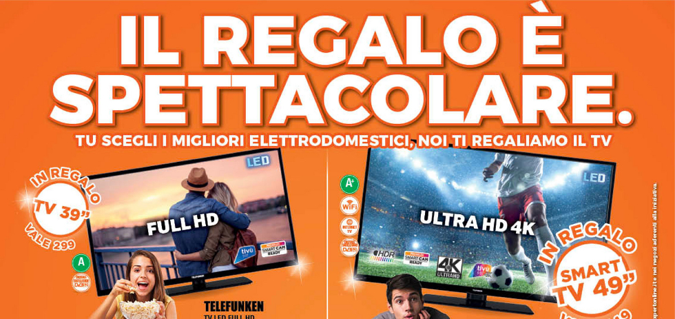 Il titolo è in linea con gli altri gruppi della catena, ovvero “Il regalo è spettacolare” ed infatti ci vengono proposti entrambi i tv che potrete avere in omaggio in caso di acquisto di uno degli elettrodomestici selezionati.