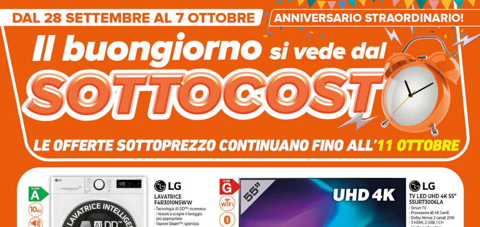 Titola “Sottocosto” e in copertina al solito abbiamo un’anteprima del contenuto con alcune delle offerte più appetibili a rappresentare le diverse categorie, per avere una panoramica di ciò che troveremo all’interno. Per esempio padroneggia per quanto riguarda i grandi Elettrodomestici una lavatrice LG classe A con carico di 10 kg a €499. Si mettono subito in campo i prodotti più ambiti della telefonia, con in evidenza in prima pagina il Samsung Galaxy S23 a €649,90.
