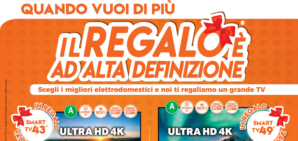 Il titolo è “Il regalo ad alta definizione” ed in copertina troviamo la lavatrice Electrolux a €599, e l’asciugatrice Aeg a €799, che ci frutterebbero rispettivamente un TV 43″ dal valore di €349 ed un TV 49″ dal valore di €449, entrambi marca Telefunken.