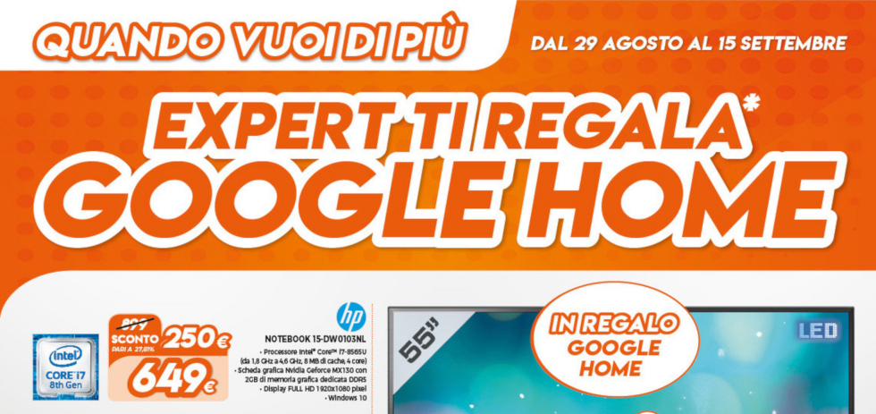 Il titolo è “Expert ti regala Google Home” ed in copertina abbiamo il notebook HP 15DW0103NL a €649 ed il TV LG 55UM7100PLB a €479, oltre i due Google Home che vi verranno dati in omaggio in caso di determinati acquisti.