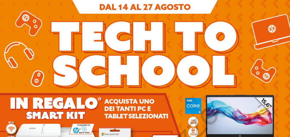 Titola “Tech to school” e infatti a caratterizzare questa splendida copertina abbiamo gli articoli più usati in queste circostanze. Innanzitutto un notebook HP con ram da 16 GB al prezzo bomba di €499. Inoltre, in questo volantino la catena decide di farci un bellissimo regalo, ossia uno smart kit. Si tratta di una stampante hp e un microsoft personal che si riceve in regalo acquistando uno dei notebook o tablet selezionati, per non farci mancare nessuno degli strumenti necessari per questo rientro sui banchi.