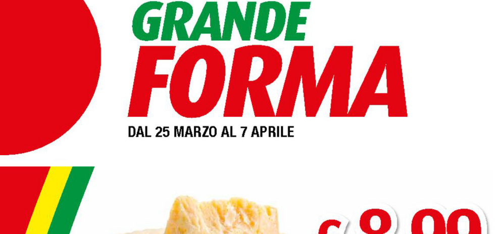 Il titolo è “Grande forma” ed in copertina troviamo il Grana Padano a €8,99, mentre all’interno troviamo il prosciutto cotto Rovagnati a €19,90, il filetto di persico a €8,90 e gli hambuerger di pollo con speck a €8,90.