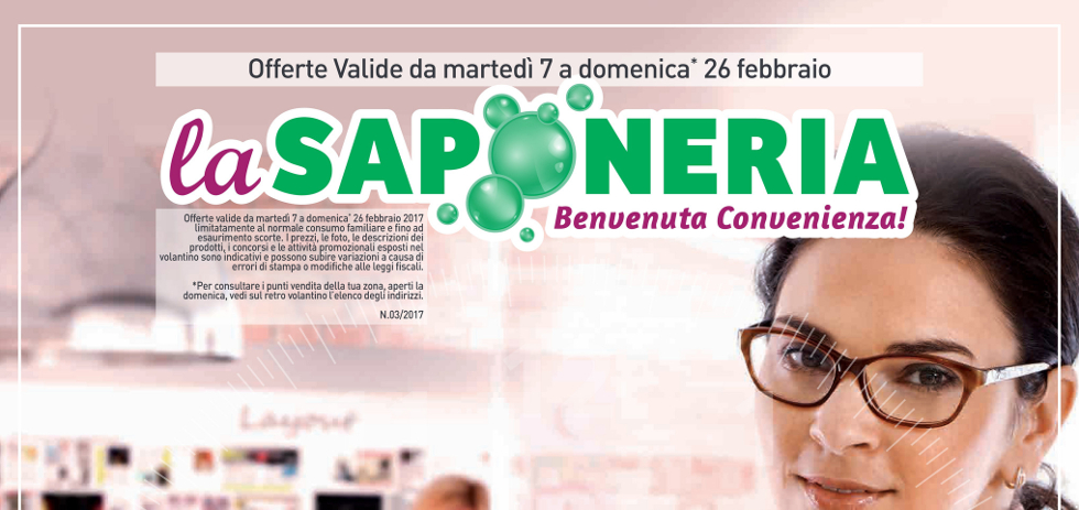 Sarà valido da oggi fino al 26 Febbraio 2017 il nuovo volantino La Saponeria, diamogli un’occhiata insieme:
