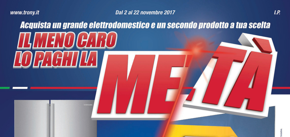 Il titolo del nuovo volantino Papino Trony è “Il meno caro lo paghi la metà” e sarà valido dal 2 al 22 Novembre 2017.