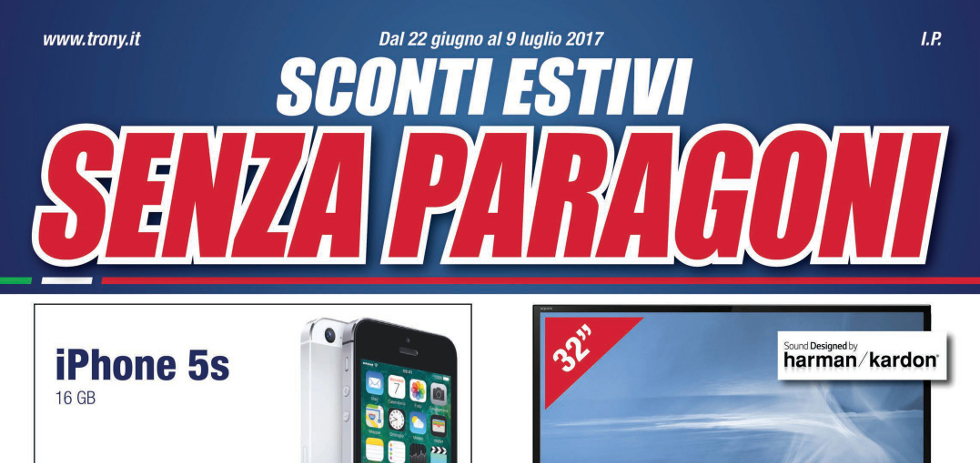 Il titolo è “Sconti estivi senza paragoni” e in copertina ci propone l’iPhone 5S a €269,99, il TV Sharp LC32CHG4042E a €199,99, la lavatrice Vexa LV510 a €169,99 e il notebook Acer E5-553-T17H a €599,99.