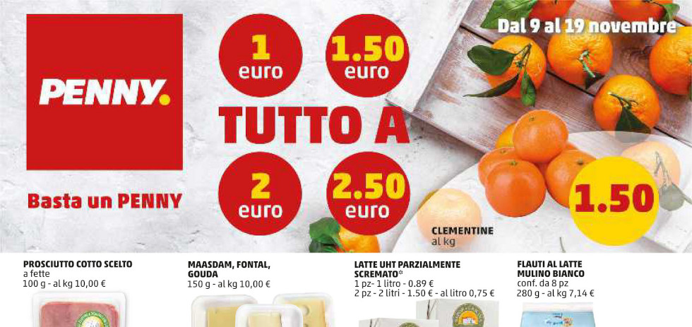 Titola “Tutto a €1, €1,50, €2, €2,50“ e non c’è bisogno di ulteriori introduzioni! Subito in copertina abbiamo un assaggio della convenienza che troveremo in questo magico volantino. Gli esempi sono uno per ogni fascia di prezzo, per esempio a €1 si può avere il magico prosciutto cotto, mentre a €1,50 due buste di latte parzialmente scremato. Inoltre scopriamo subito che dal 09 al 12 Novembre torna lo Spendi & Riprendi con cui si ottiene un buono spesa da €10 ogni €40 spesi da utilizzare la settimana successiva.