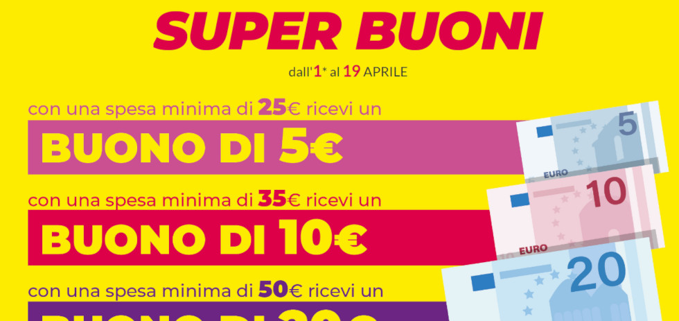 Il titolo però non smentisce la convenienza che ci aspettiamo. Si tratta di “Super buoni” che si raccolgono dall’1 al 19 Aprile, e rappresentano quindi la grande promozione protagonista di questo volantino. A seconda dell’importo speso si ottiene un buono di un valore diverso: