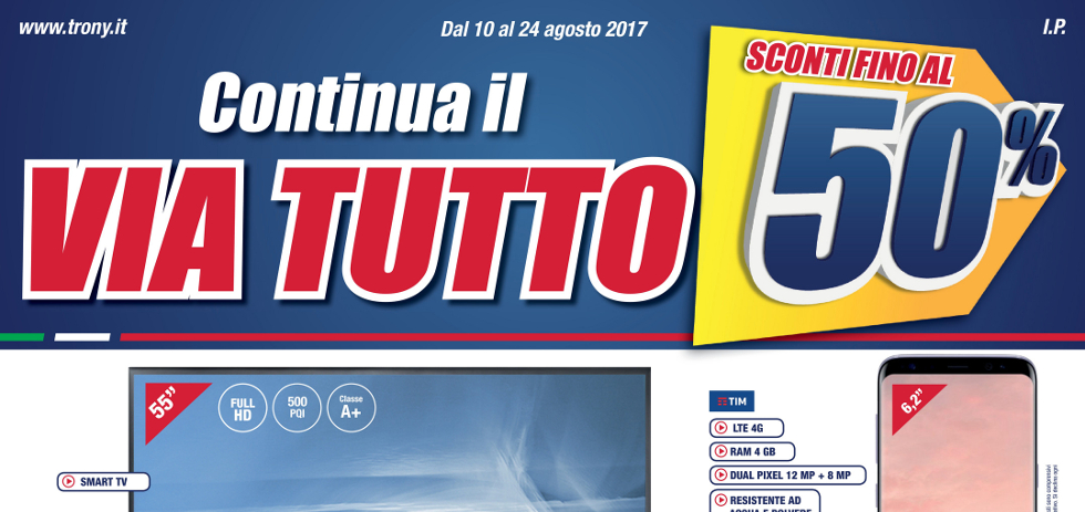 Sarà valido da domani 10 fino al 24 Agosto il nuovo volantino Trony “Continua il via tutto sconti fino al 50%“.
