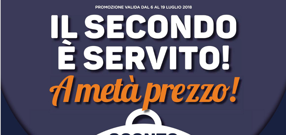 Il titolo è “Il secondo è servito!” e si riferisce alla promozione principale che prevede lo sconto del 50% sul meno caro nell’acquisto di due articoli; per usufruire dell’offerta bisognerà che almeno dei due articoli costi almeno €499.