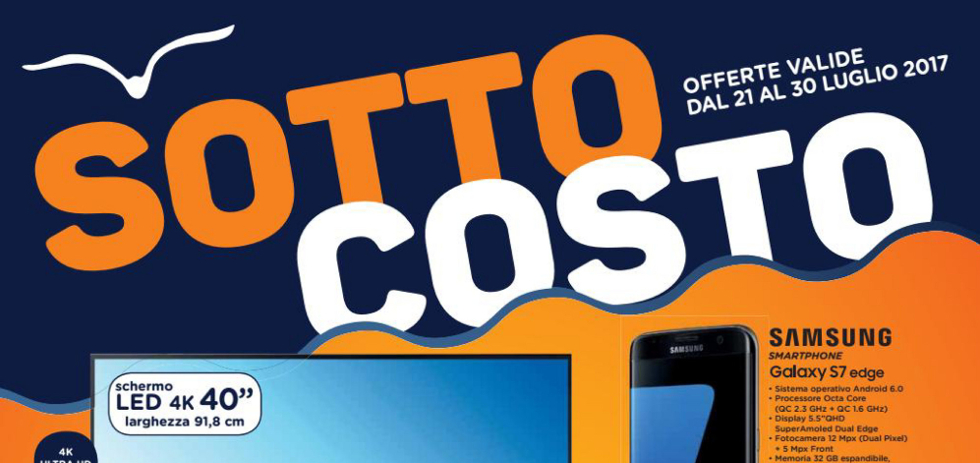 Vi consigliamo di approfittare del “Sotto costo” proposto dalla catena che ci accompagnerà dal 21 al 30 luglio 2017, in copertina infatti iniziano ad affiorare i primi sconti che risultano delle vere e proprie occasioni, come ad esempio il Galaxy S7 Edge a soli €479 o la lavatrice LG F14U1JBS6 a €499.